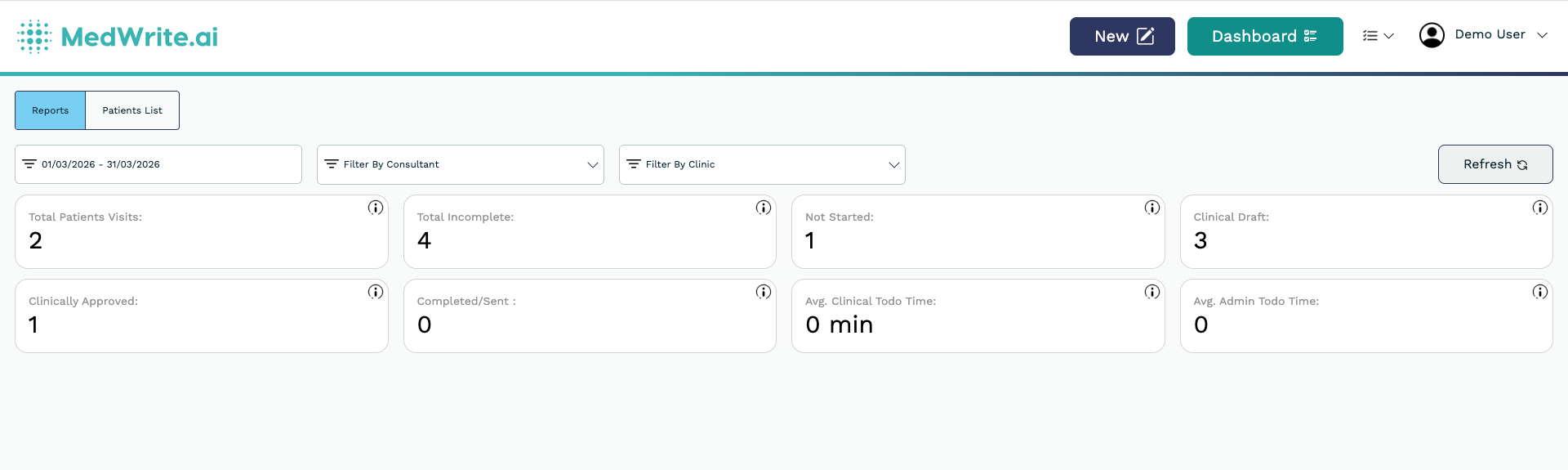 A new tabbed view separating Reports from Patient Management. KPI tiles for patient volume, wait times, admission rates, and discharge metrics - each with a tooltip explaining what it measures. Filter by clinic, consultant, and date range with live updates.