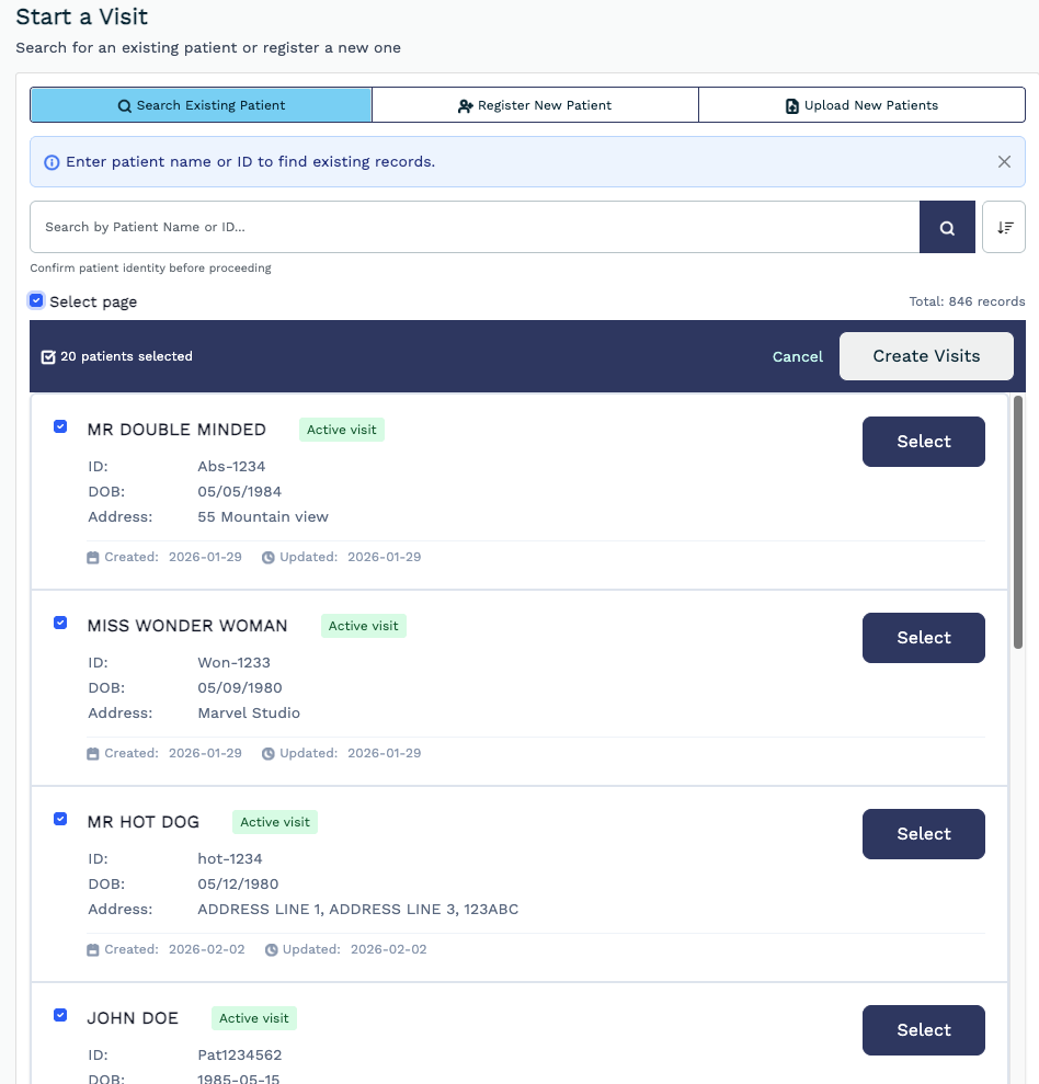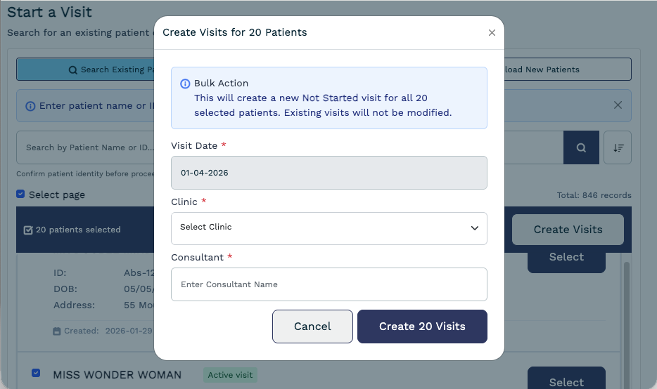 Create visits for multiple patients in a single action. Select patients from your list, assign a visit type, clinic, and consultant, then batch-create. No more one-by-one data entry for clinic setup or end-of-day closures.